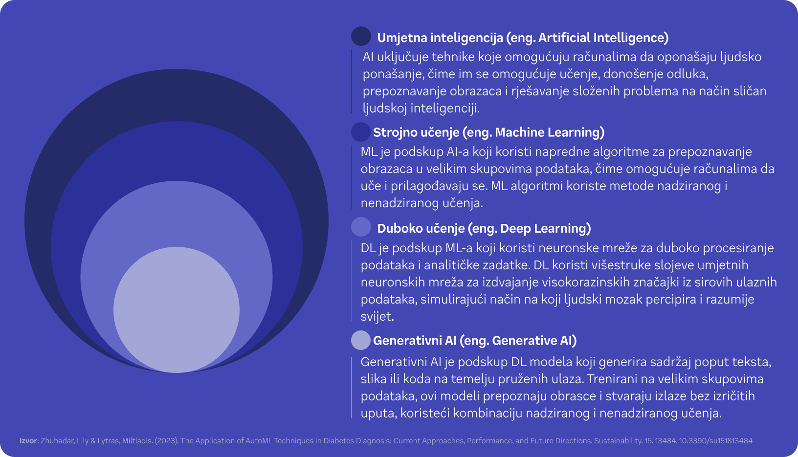 Generativna umjetna inteligencija (GenAI), s druge strane, predstavlja najnoviju granu dubokog učenja koja se fokusira na stvaranje novog sadržaja (poput teksta, slika ili glazbe) iz postojećih podataka. Ranije spomenuti ChatGPT je izvrstan primjer. Usko povezan s ChatGPT-om je koncept velikih jezičnih modela (engleski large language models, akronim LLM), jedan od najznačajnijih pojmova današnjice. Pokretan naprednim velikim jezičnim modelima koje je razvila OpenAI, ChatGPT koristi duboke neuronske mreže i ogromne tekstualne skupove podataka za generiranje koherentnih i kontekstualno prikladnih odgovora.