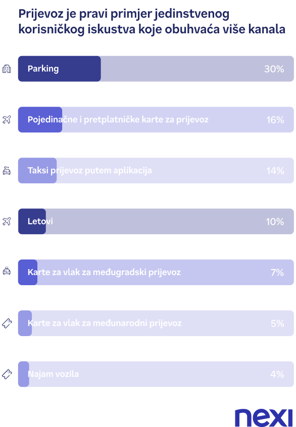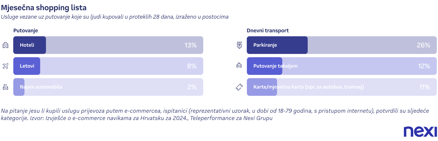 Prema istraživanju Nexi Grupe, Hrvati redovito koriste jedinstveno iskustvo kupnje kroz više kanala. Slika prikazuje postotak hrvatskih korisnika interneta obuhvaćenih ispitivanjem koji su tijekom godine kupovali online usluge iz prikazane liste.