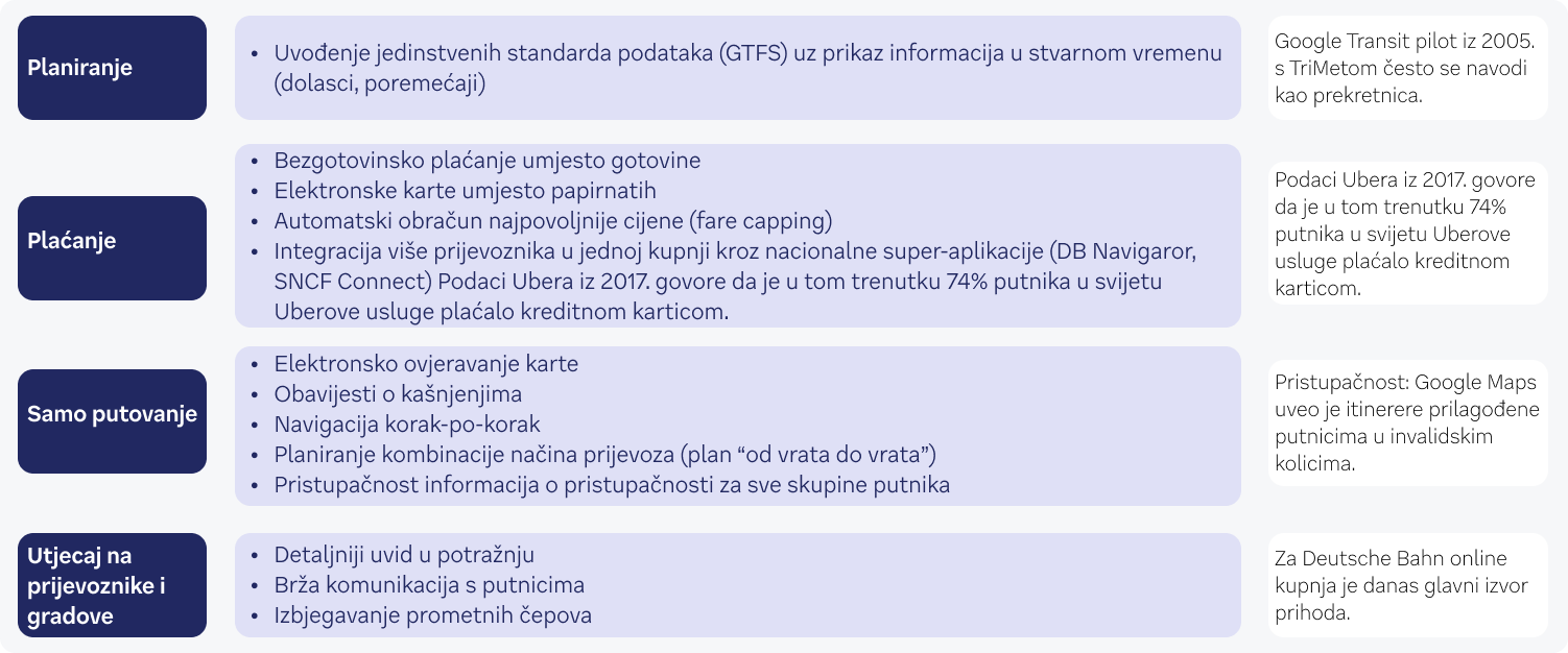Mobilne aplikacije za prijevoz danas objedinjuju tri stvari koje su se nekoć događale odvojeno: planiranje rute, kupnju/plaćanje i navigaciju uživo.
