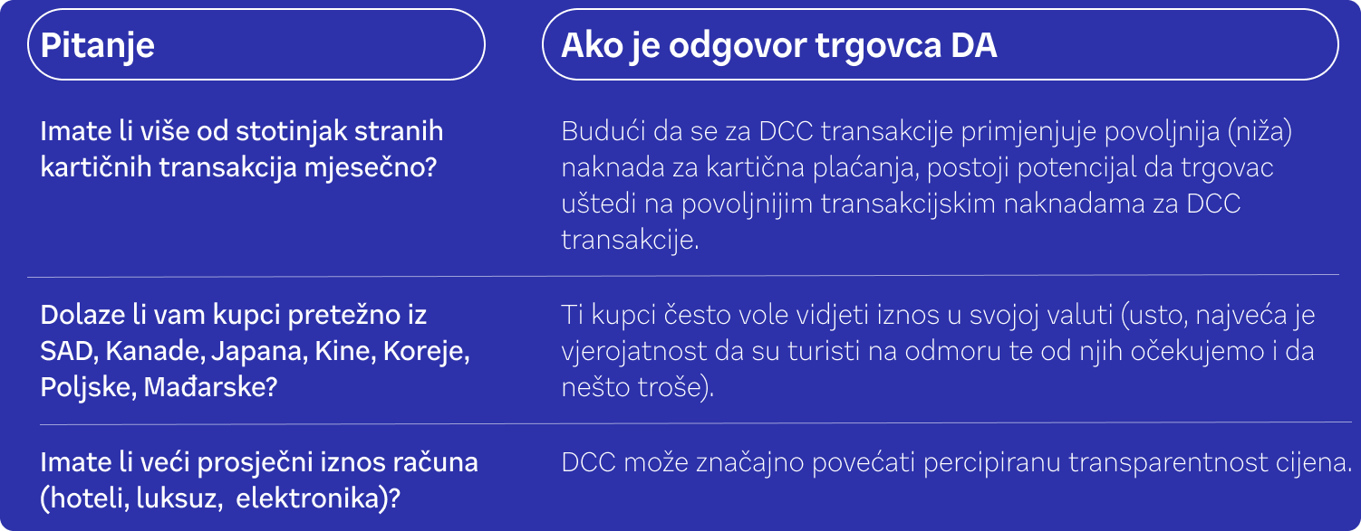 Oni dobivaju stabilnu uštedu na operativnim troškovima – i možda još zadovoljnijeg kupca, s time da primjena DCC usluge ne utječe na rad POS uređaj ili iskustvo plaćanja kupaca koji koriste karticu u eurima.